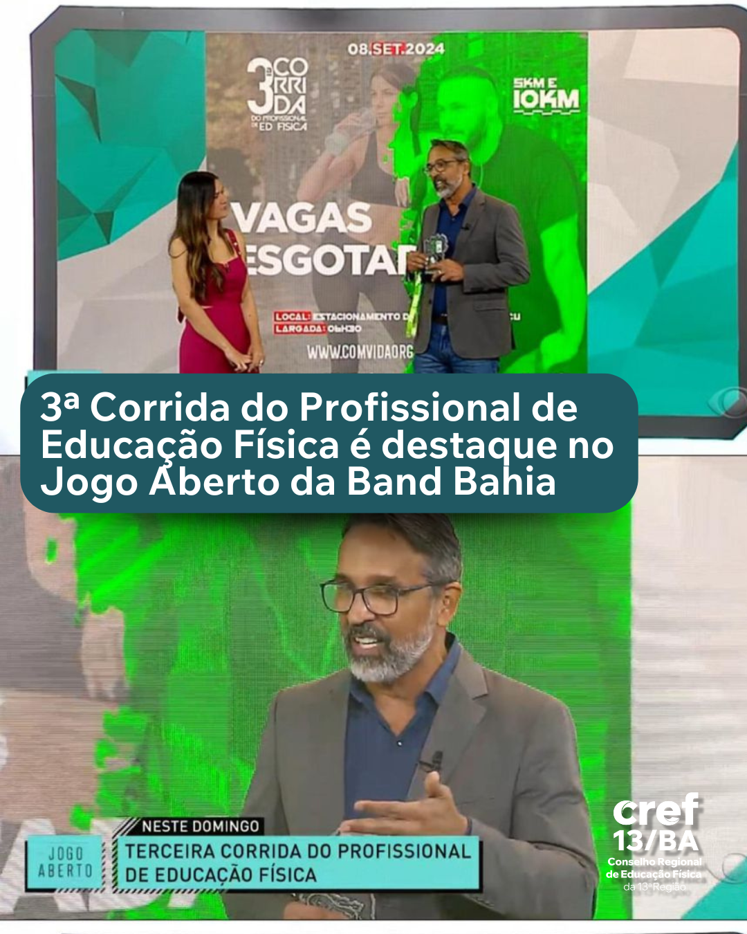 O CREF13/BA, representado pelo presidente Rogério Moura, participou do programa Jogo Aberto, comandado pela apresentadora Juliana Guimarães, nesta quarta-feira (04). Durante o programa, Rogério Moura falou sobre a 3ª Corrida do Profissional de Educação Física, que acontece neste domingo (08), com largada às 6h30 no Estacionamento de Pituaçu!