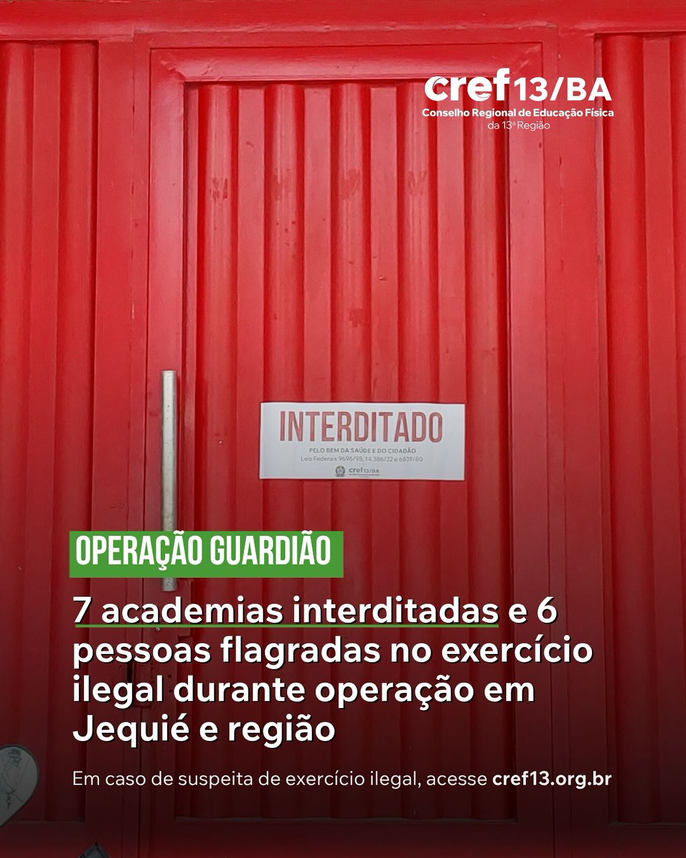 O Departamento de Orientação e Fiscalização do CREF13/BA realizou, ao longo de duas semanas, a Operação Guardião na cidade de Jequié e região. As equipes visitaram 91 estabelecimentos, entre academias, escolas e espaços públicos.