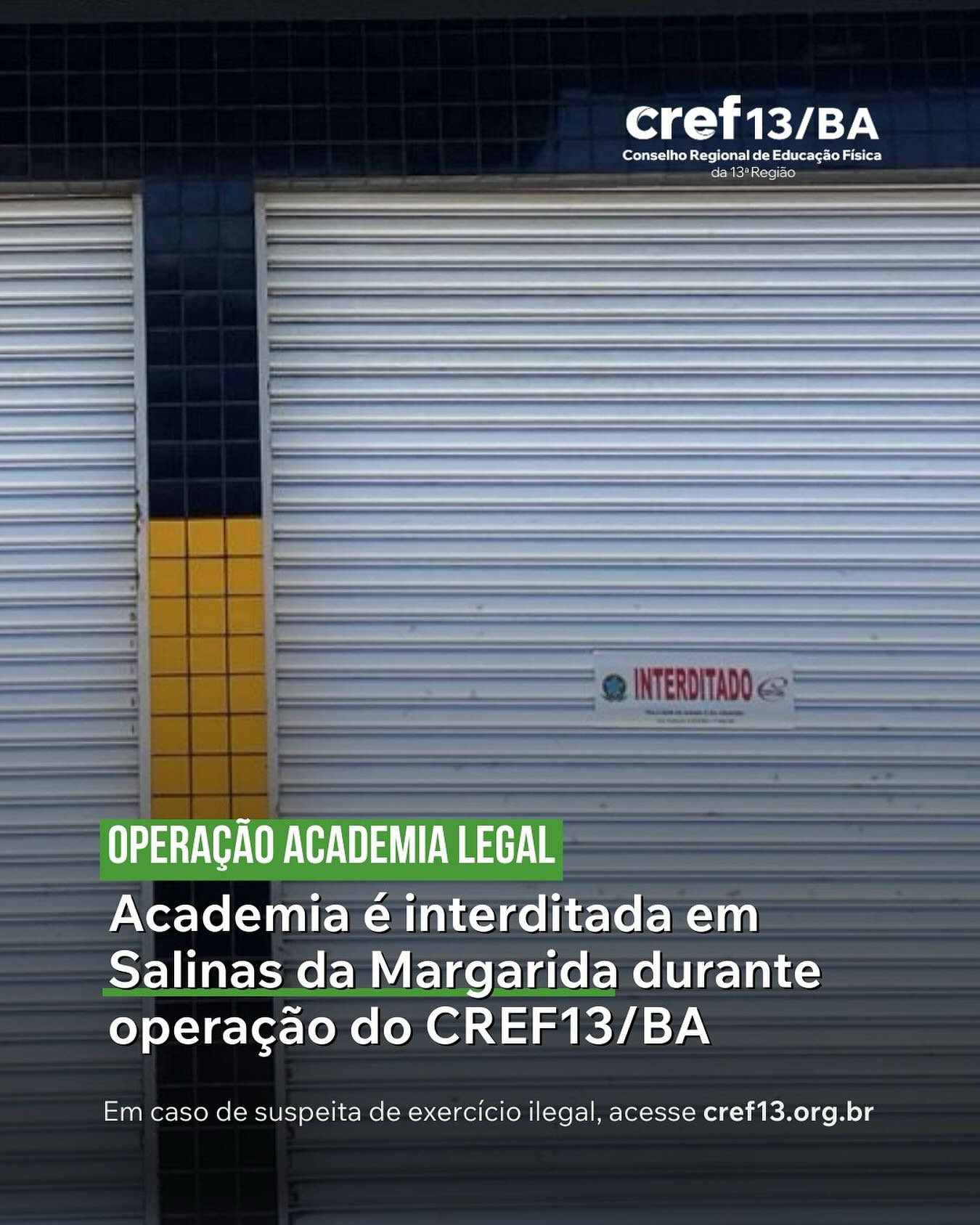 Durante a Operação Academia Legal, o Departamento de Orientação e Fiscalização do CREF13/BA interditou uma academia em Salinas da Margarida, por descumprimento às Leis Federais nº 9.696/98, nº 14.386/22 e nº 6.839/80.