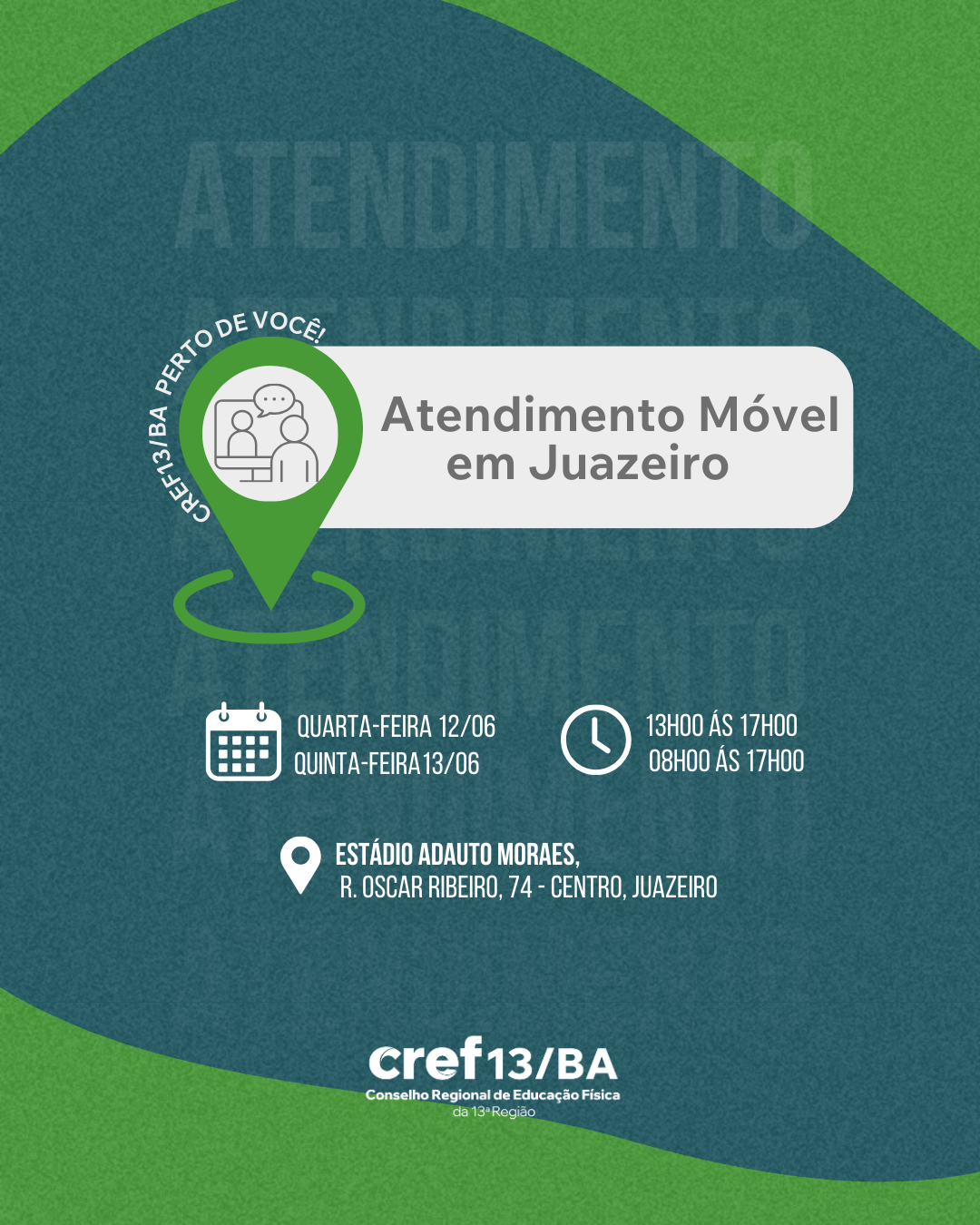 Os atendimentos acontecerão nos dias 12 e 13 de junho, na cidade de Juazeiro, no Estádio Adauto Moraes, localizado na Rua Oscar Ribeiro, 74 – Centro, Juazeiro – BA, 48904-090. Na quarta-feira (12), os atendimentos serão das 13:00 às 17:00, e na quinta-feira (13), das 08:00 às 17:00.