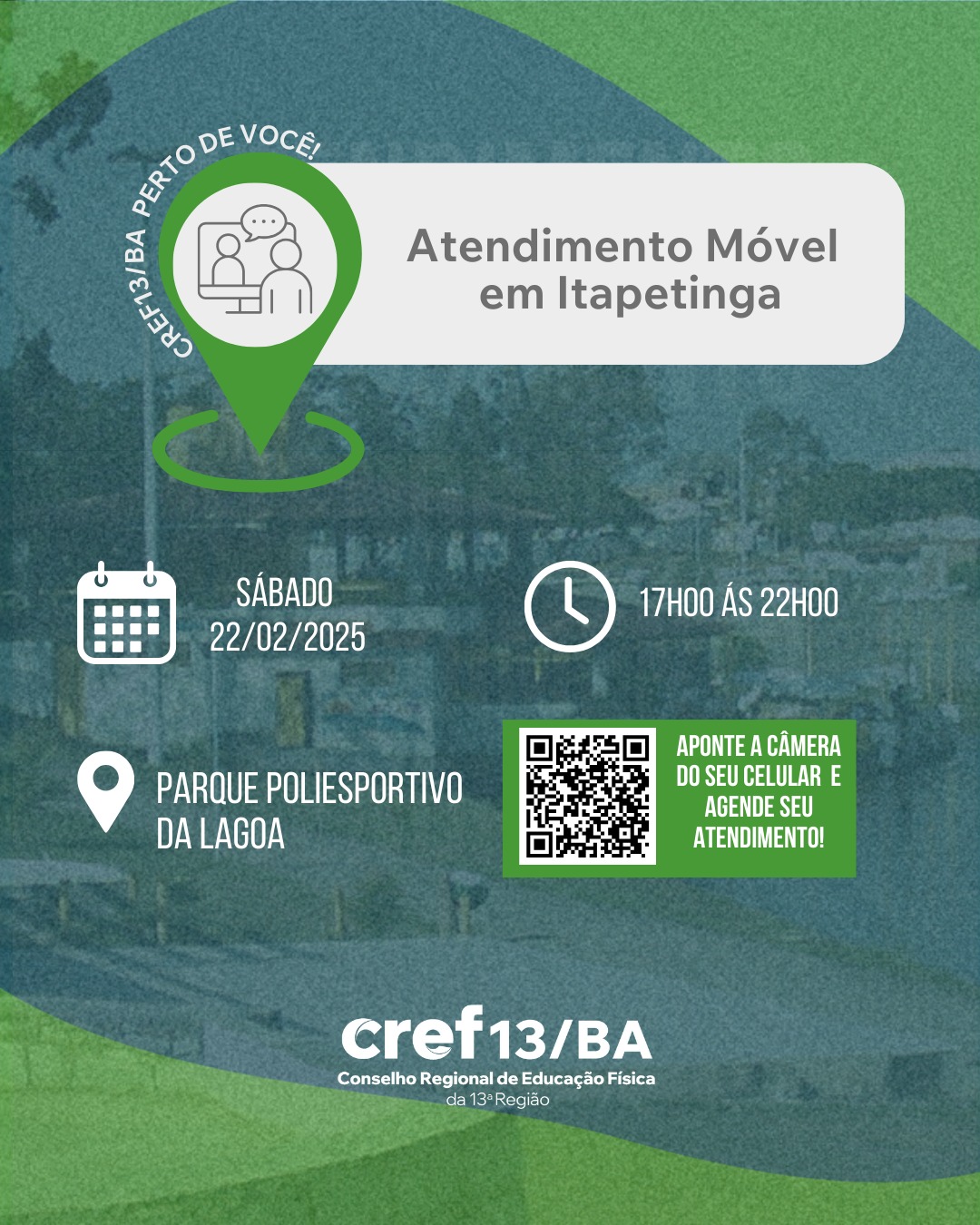 Os atendimentos acontecerão no sábado, 22 de Fevereiro de 2025, no Parque Poliesportivo da Lagoa, Itapetinga, BA, 45700-000. No sábado (22), os atendimentos serão das 17:00 às 22:00.