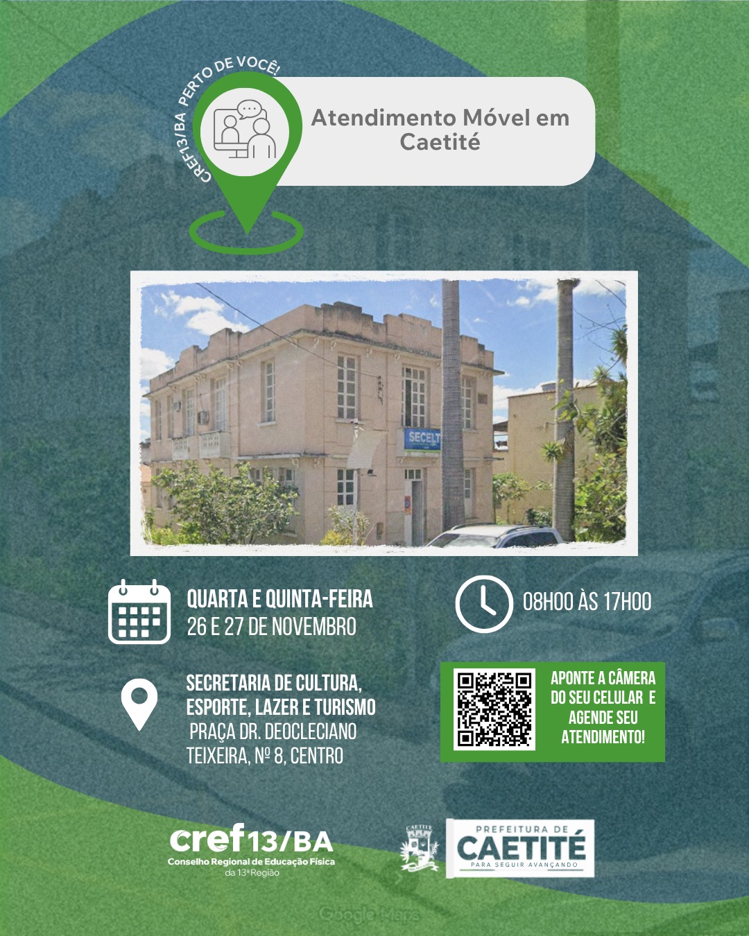O CREF13/BA realizará atendimento móvel em Caetité nos dias 26 e 27 de novembro, das 08h às 17h, na Secretaria de Cultura, Esporte, Lazer e Turismo, localizada na Praça Dr. Deocleciano Teixeira, nº 8, Centro.