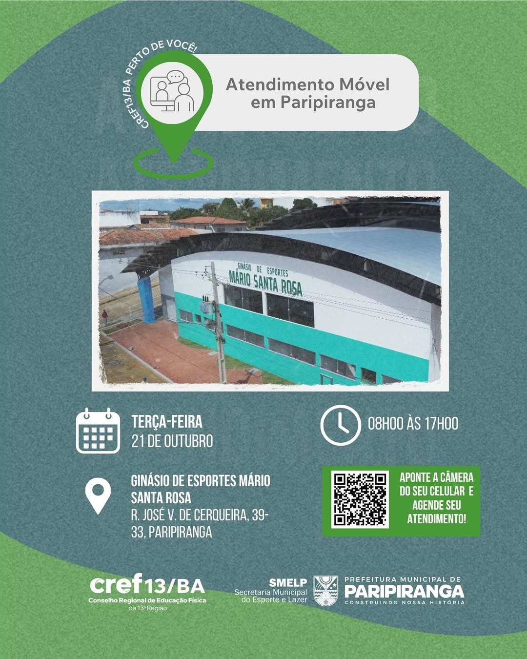 No dia 21 de outubro, o CREF13/BA realizará atendimento móvel no município de Paripiranga, das 8h às 17hrs, no Ginásio de Esportes Mário Santa Rosa, localizado na Rua José V. de Cerqueira, 39-33.