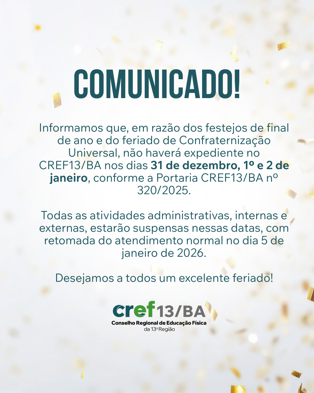 Informamos que, em razão dos festejos de final de ano e do feriado de Confraternização Universal, não haverá expediente no CREF13/BA nos dias 31 de dezembro, 1º e 2 de janeiro, conforme a Portaria CREF13/BA nº 320/2025.
