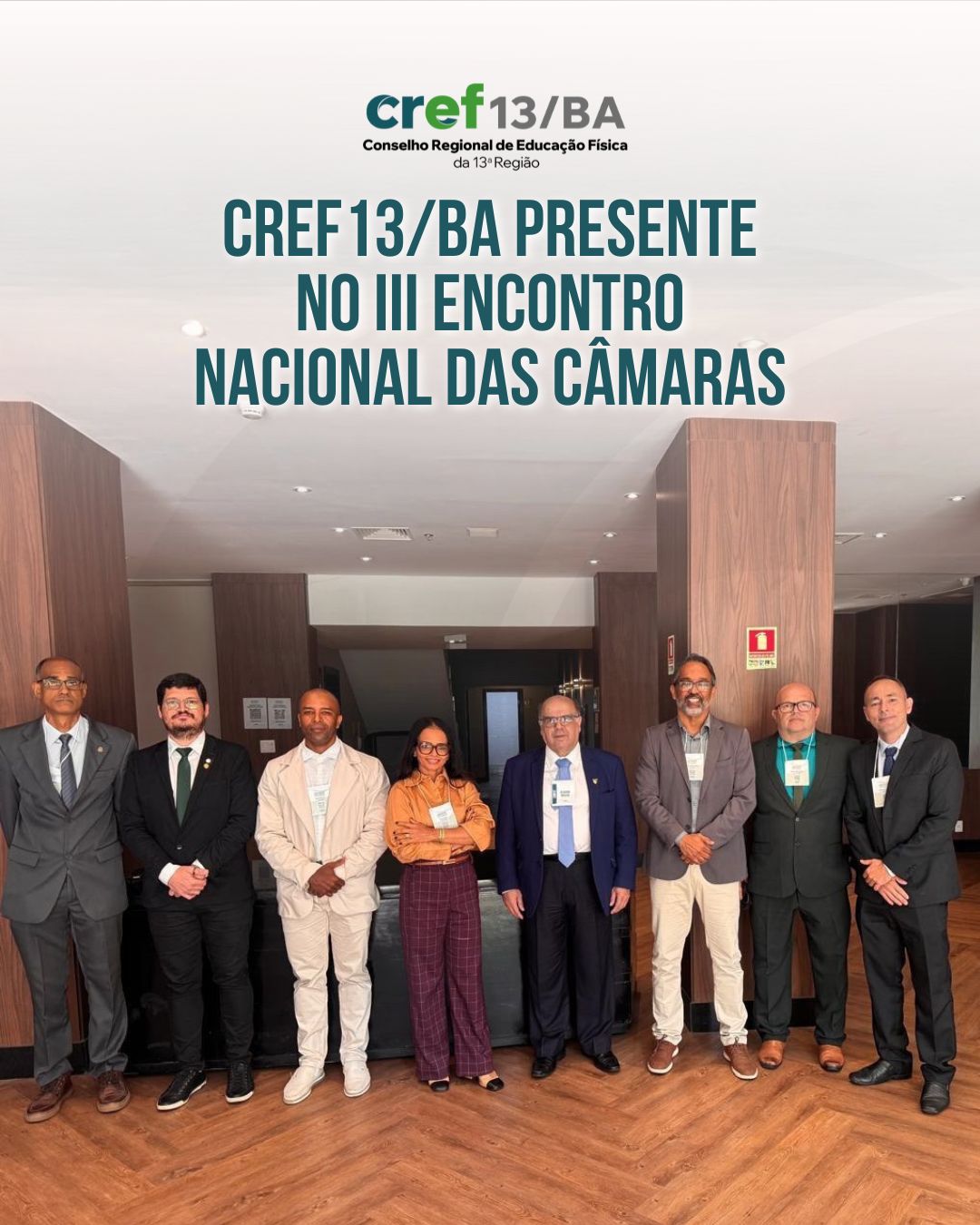 O CREF13/BA participou do III Encontro Nacional das Câmaras do Sistema CONFEF/CREFs, realizado nos dias 13 e 14 de novembro de 2025, em Brasília/DF. Além do presidente do Conselho baiano, Rogério Moura (CREF 01726-G/BA), estiveram presentes o presidente do CONFEF, Claudio Augusto Boschi (CREF 000003-G/MG), o Conselheiro Federal Francisco Canindé (CREF 01280-G/BA), bem como os presidentes das Câmaras do CREF13/BA: