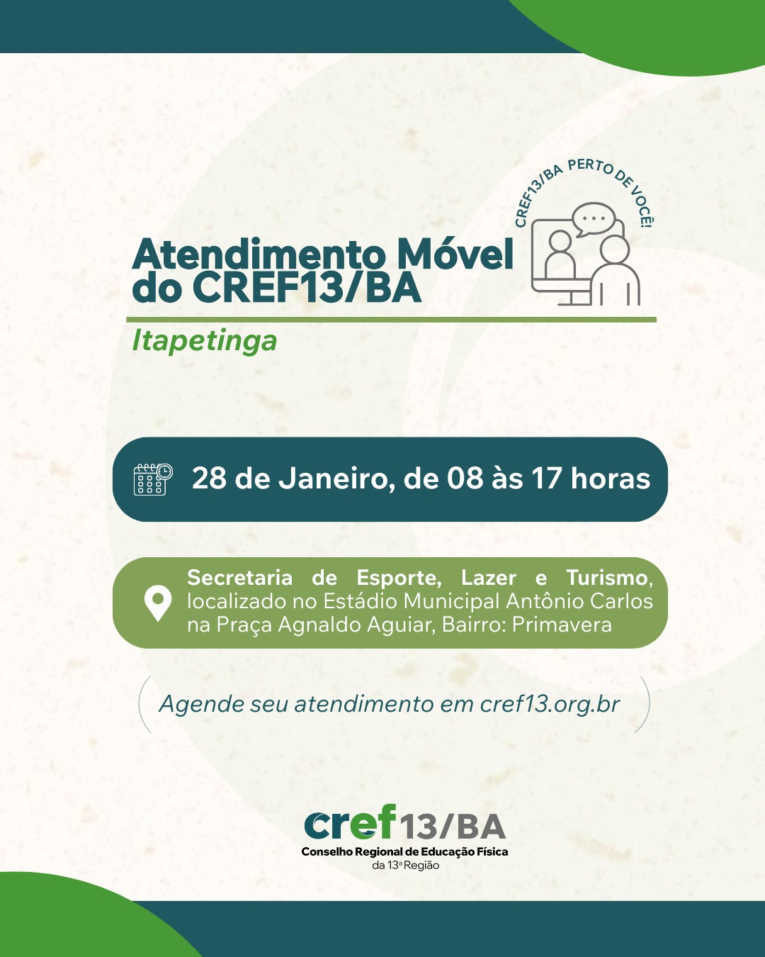O CREF13/BA estará em Itapetinga no dia 28 de janeiro, com atendimento móvel das 08h às 17h, na Secretaria de Esporte, Lazer e Turismo, localizada no Estádio Municipal Antônio Carlos, na Praça Agnaldo Aguiar, Bairro Primavera.