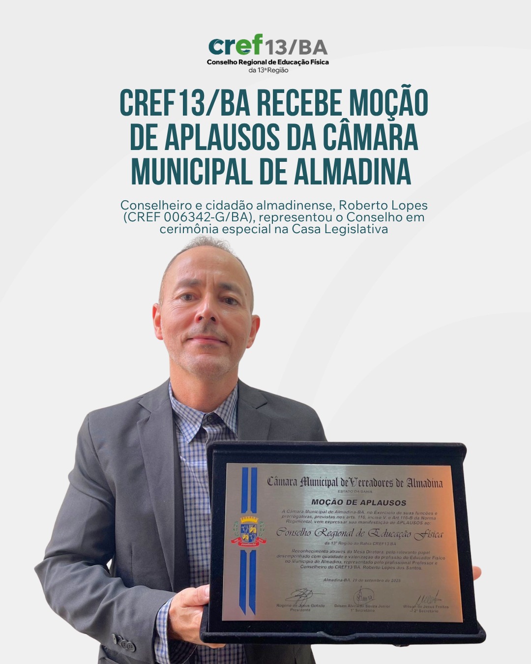 O CREF13/BA foi homenageado pela Câmara Municipal de Almadina com uma Moção de Aplausos, em reconhecimento à atuação do Conselho na promoção e valorização da Educação Física. A honraria foi recebida pelo representante do Conselho na região, o Conselheiro Roberto Lopes (CREF 006342-G/BA), cidadão de Almadina. A cerimônia ocorreu no dia 29 de setembro e contou com a presença da Mesa Diretora da Câmara de Vereadores. O CREF13/BA agradece a homenagem e reforça seu compromisso com todos os municípios baianos, atuando para proteger a sociedade e assegurar a presença de profissionais de Educação Física registrados e éticos.