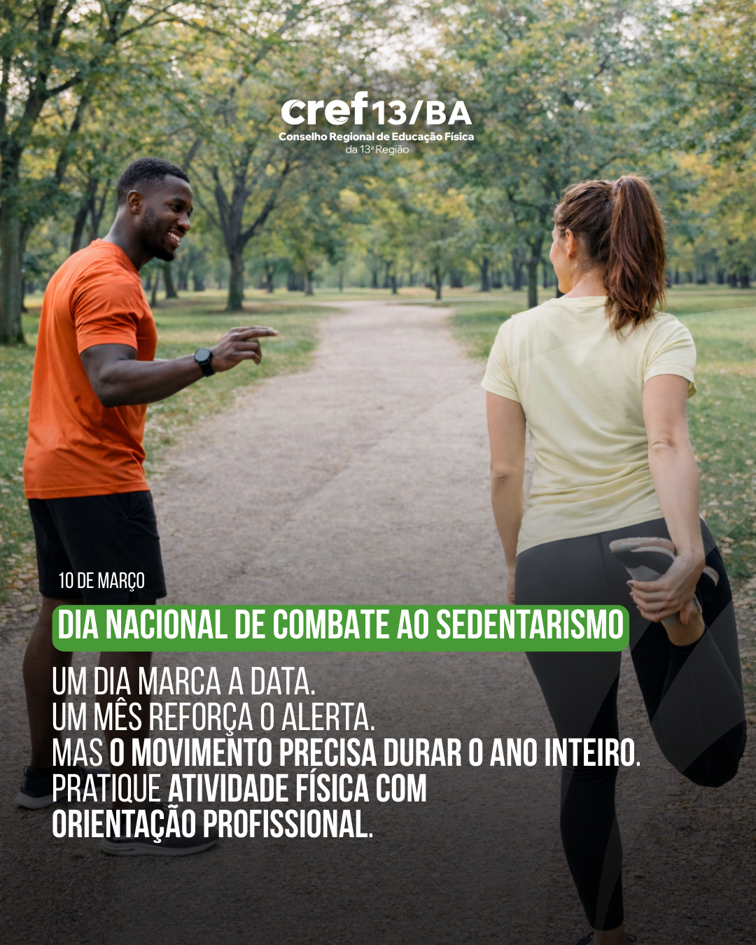 Hoje é o Dia Nacional de Combate ao Sedentarismo, e também se aproxima o Abril Verde, mês dedicado à conscientização e ao enfrentamento do sedentarismo, um momento de protagonismo do Profissional de Educação Física.