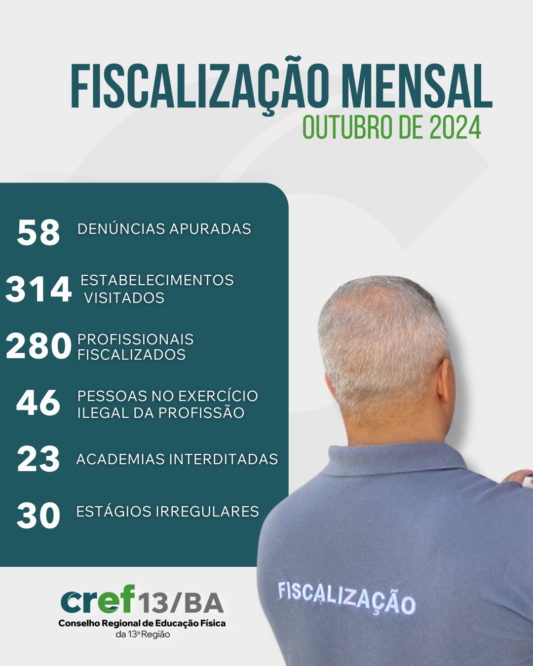 No mês de outubro, o CREF13/BA intensificou a fiscalização para garantir a qualidade e segurança dos serviços de Educação Física na Bahia. Veja os resultados:
