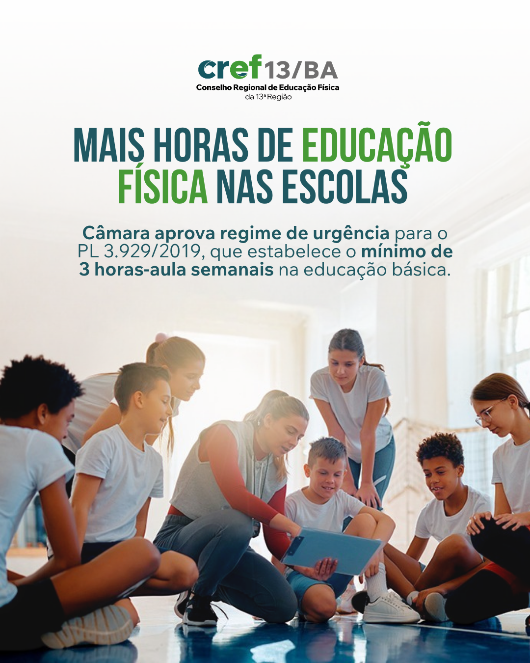 O Projeto de Lei nº 3.929/2019 avança nesse debate ao propor a definição de no mínimo 3 horas-aula semanais, fortalecendo o papel da disciplina na formação integral dos estudantes. A proposta dialoga com recomendações da Organização Mundial da Saúde, que indica a prática regular de atividade física como essencial para crianças e adolescentes, e reconhece a escola como o ambiente mais democrático para garantir esse acesso.