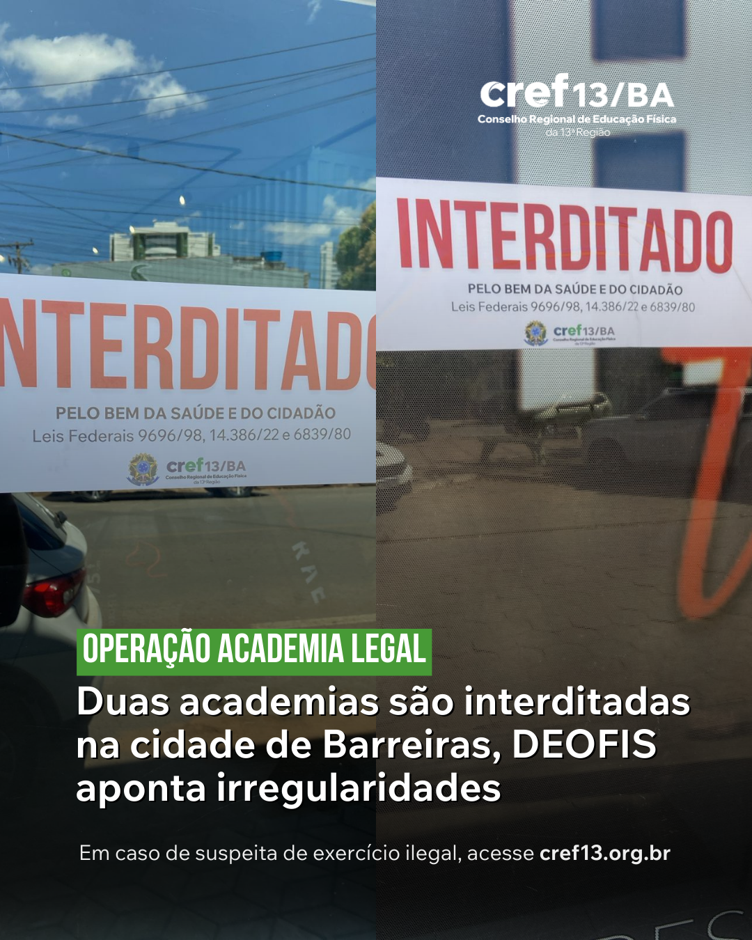 O Departamento de Orientação e Fiscalização (DEOFIS) do CREF13/BA interditou duas academias no município de Barreiras, região Oeste da Bahia. As irregularidades identificadas que motivaram o fechamento dos estabelecimentos são: ausência de registro, ausência de Profissional de Educação Física formado e registrado, além da falta de Responsável Técnico, entre outros.