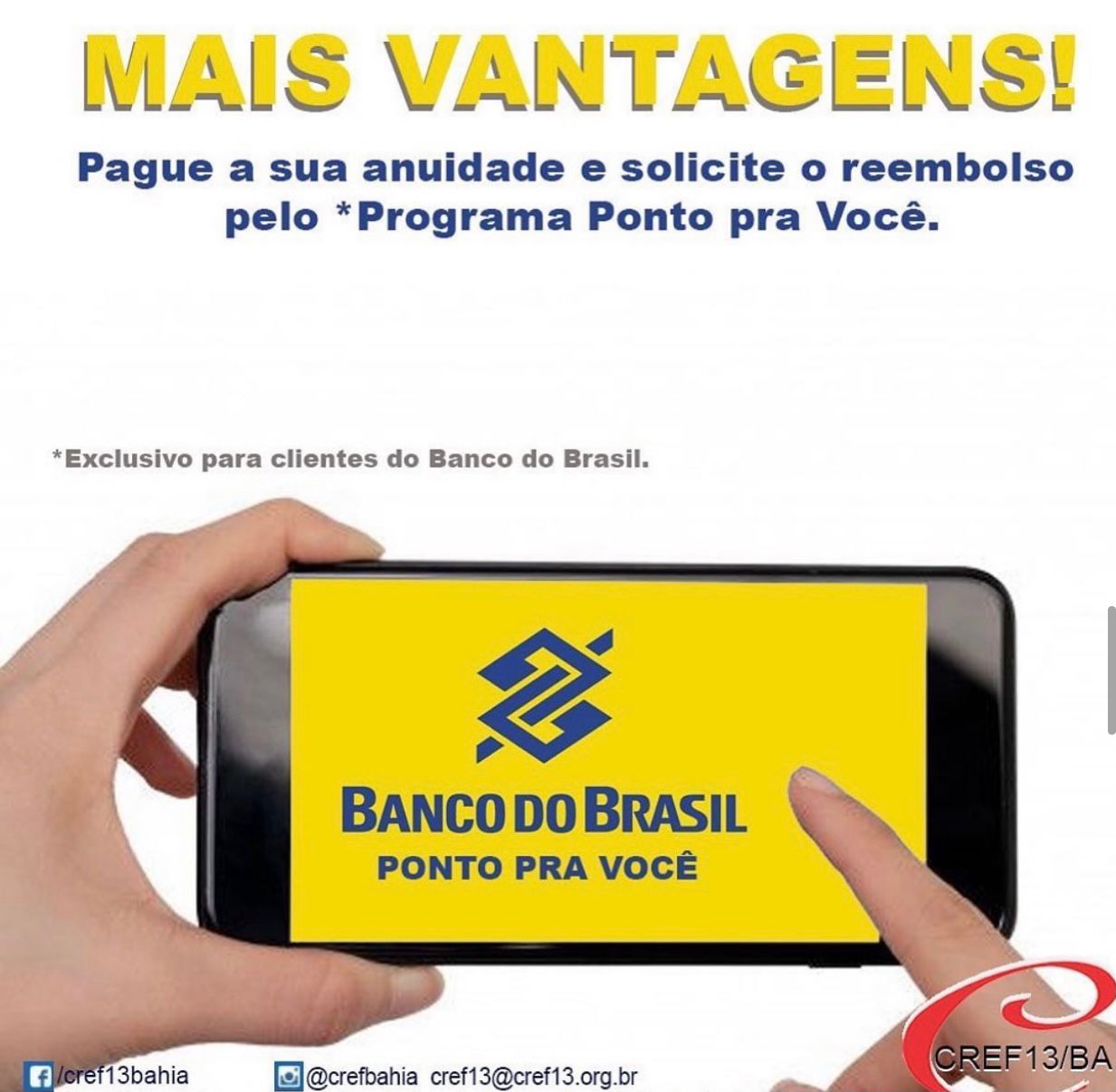 Desde o ano passado o Conselho Regional de Educação Física da Bahia (CREF13/BA) conseguiu mais uma vantagem para os Profissionais de Educação Física da Bahia ao firmar um convênio com o Banco do Brasil, para que os profissionais registrados que sejam correntistas participantes do programa Ponto pra Você possam ter o ressarcimento em dinheiro de 100% do valor pago na anuidade do CREF13/BA.