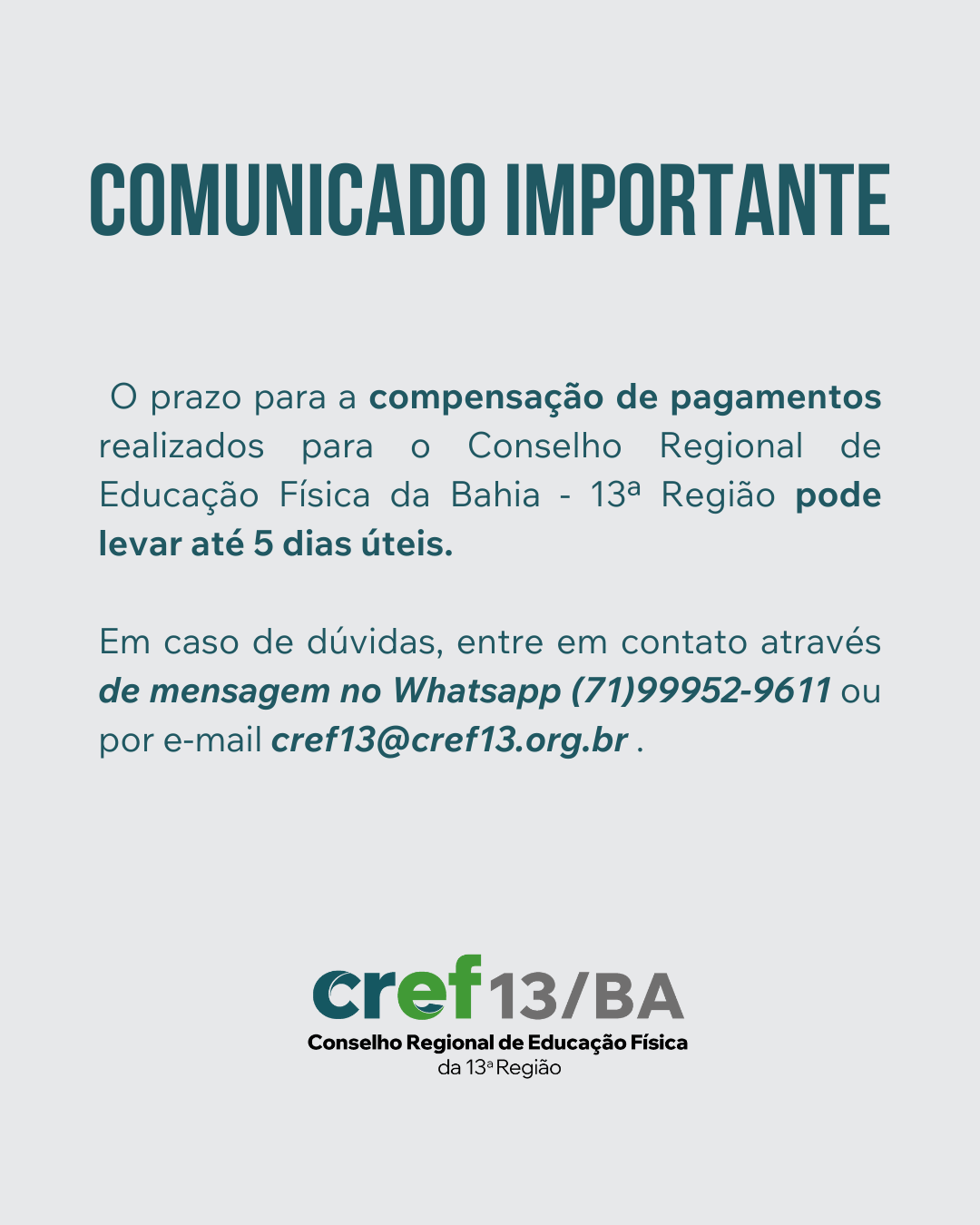 O prazo para a compensação de pagamentos realizados para o Conselho Regional de Educação Física da Bahia – 13ª Região pode levar até 5 dias úteis.